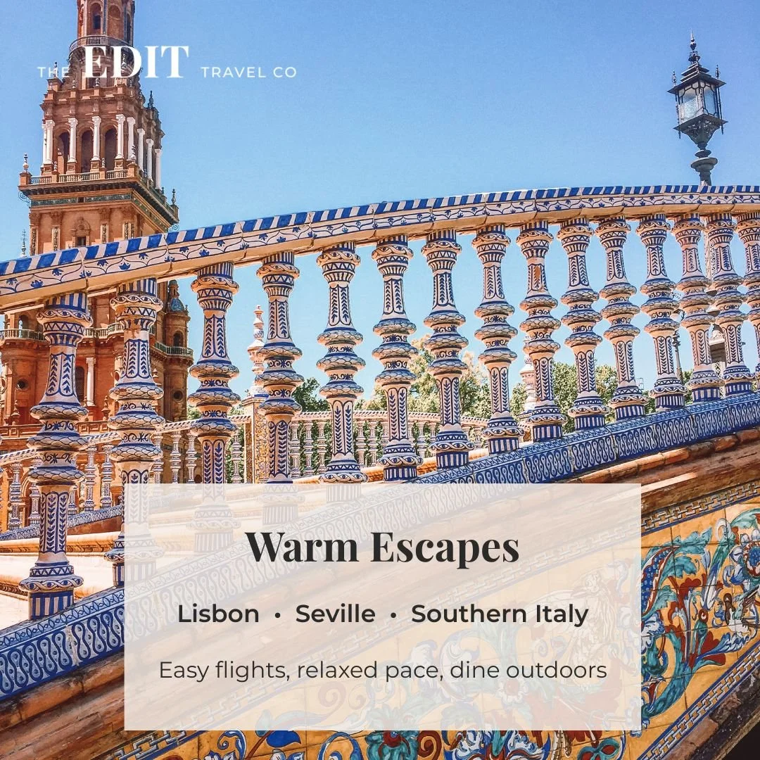 For warmth, look to Lisbon, Seville, or southern Italy for easy flights, mild days, and local life still in full swing.